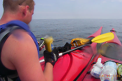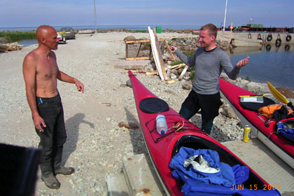 Aizstiepjam kajakus blakus molam līdz jūrai. Krastā sēž, smēķē un skatās jūrā kāds cilvēks: “…Roņu sala…. Jā, kādas 18 jūras jūdzes būs. Uzmanās no kuģiem. Tie neskatās un nevienam nedod ceļu” – tāds ir bijušā zvejnieka padoms. Arī mēs uzsmēķējam pa “pēdējai” cigaretei. Pulkstens rāda 9.40.