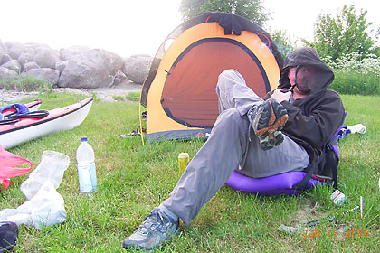 Kajakus nekur stiept negribās. “Kur mēs varam uzcelt telti? Vai drīkst tepat?” – rādam uz miniatūru pļaviņu ostā, kas izskatās izpļauta speciāli šim mērķim. “Jā, ir OK”. Robežsargs aizbrauc.
