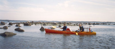 - Izsaku secinājumu, ka iet jūrā, lai šķērsotu šaurumu, kas ir gan tikai savi 5-6km (t.i. tiktu līdz tās pašas bākas salai, tikai no otras puses nekā braucienā ap Muhu). Ir skaidrs, ka pie krasta jau ir „ pa šerpu” un zinu, ka atklātā pleķī vējš un viļņi būs ieskrējušies daudz spēcīgāk un var sanākt auzas. Izsaku domu- lai diena nebūtu zemē mesta- apbraucam mazās salas ragu uz kura stāvam un gar pašu krastu varam palēkāt nedaudz pa viļņiem, tad uztaisīt apmetni un gaidīt varbūt pēcpusdienā vējš nokritīsies un tad domāt par maršrutu.