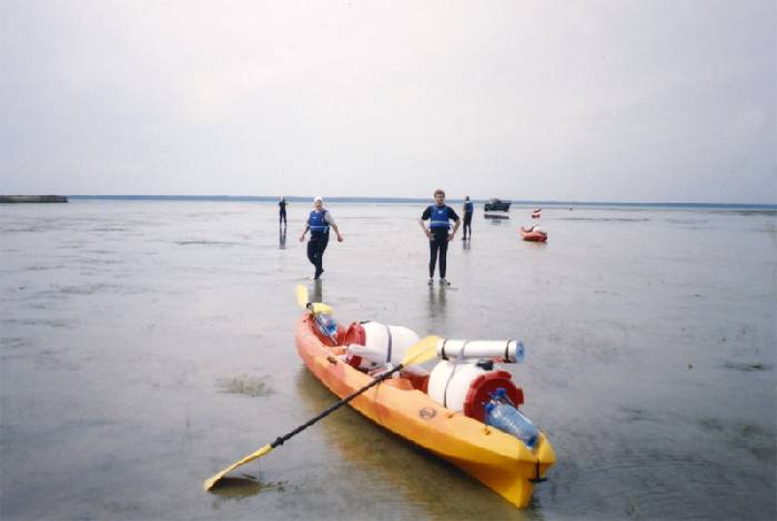 - Pasākums notika nedēļas dažas atpakaļ tajā pat rajonā (Virtsu-Muha). Krastā bija gana aizvējš, bet bija skaidrs, ka jūrā būs „pavisam cita lieta”. Sapakojāmies un, pirms domāt šķērsot Muhas šaurumu (virzienā no „kontinenta” nedaudz uz dienvidiem no Virtsu ostas), salēmām, ka dabraucam pa aizvēju līdz pēdējās mazākas salas „ragam”, kas atrodas kādus km 2 no krasta, izejam krastā aizvēja pusē, pārčāpojam pāri raga spicei, lai izietu vēja un atklātās jūras pusē ievērtēt situāciju. Tā arī izdarījām. Aina atklātā jūrā bija ne tuvu tāda, kā tikko braucot aizvējā- vējš bija liels, vēja virziens galīgi nepateicīgs, viļņi augsti un visa jūra „balta” („plīstošie” viļņi cik vien aci rāda). Braucēji (kas būtiski!!!) bijām jauktā kompānijā- Baibā biju ar kaut arī dūšīgu un arī visād citād ļoti feinu meiteni, bet kura tomēr bez pieredzes un spēcīgas fiziskās sagatavotības un vēl vienā kajakā ar dāmīte bez pārāk lielas pieredzes.