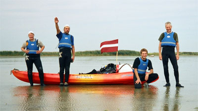 Lai izvairītos no vēja un nezinot „tālā” ūdens dziļumu Sāremā šaurumā, braucam gar krastu. Pēc stundas airējiena esam izgājuši no „sēkļa” zonas un ir plāns darīt pusdienas pauzi. Krastā, kas ir pilnīgi un galīgi neapdzīvots, ir „ kolēģu” pēdas- krastā izvilkti pāris kajaki un kanoē. Izkāpjam krastā kādi metri 100 pirms igauņu „flotes” un sākam „veidot” virtuvi. Pēc brīža, kādu gabalu nostāk, no kadiķu meža iznāk arī paši igauņu kolēģi un, redzot, ka ar esam šiem „kolēģi” , sviecienam mājot ar rokām virzās uz saviem „kuģiem” . Atsveicināmies pretī. Viens, kas laikam igauņu flotes līderis, atdalās no savējiem un nāk ciemos. Pasniedzu šam sveicienu- „Terre!” . Kolēģis atņem sveicienu ar „Terre!” , bet sarunu uzsāk krievu mēlē (jādomā, ka dēļ SarkanBaltSarkanā uz Baibas tam nebija doma, ka mēs krievi, bet gan „saskarsmei” ar latvianiem tas izvēlējās optimālāko valodu).