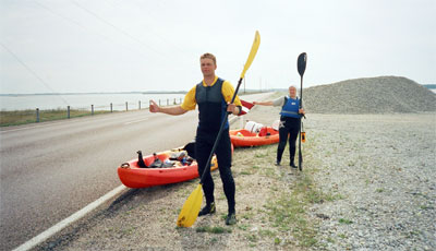 Izkāpjam uz „tilta”, uznesam laivas, promējam nobalsot kādu autiņu, lai daved līdz Sārei, bet nekā…. Iemūžinamies uz filmas i forsējam „tiltu”. Pa šoseju brauc ķenga (renault Kangoo) ar LV numuriem un ieraugot SarkanBaltSarkano uz Baibas klāja uzpīpina, pamāj ar ķepu. Mēs ar pa-sveicinām i metamies ūdenī.