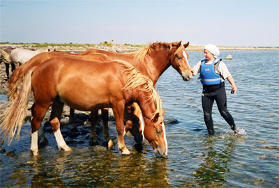 Par cik esmu nolēmis šodien braukt „ krasta baudītāja” režīmā, „uzliekot…”, tad nolemju izbraukt aizvējā (salas dienvidu gala rietumu pusē) un „ot duši” nopeldēties, kā arī aiziet sabildēt „mežonīgos horšus” . Pēc kāda brīža, kad vēl neesmu īsti izkāpis krastā, abi zirgu bari, katrs no savas salas malas aulēkšos metās viens otram pretī. Skats tāds brīvības sajūtu un romantiku veicinošs. Nodomāju- iziešu krastā un jāmēģina klusām pielavīties zirgiem tuvāk, lai nobildēt, jo tie jau muks no manis projām…! Izkāpu krastā, paņemu foķiku i velkos „ klusi” virzienā uz zirgu baru ar apziņu, ka neko tuvu jau, diemžēl, pieiet nesanāks…. Šulcs ar Luīzi ar, redzot, ka taisos izkāpt krastā ir apstājušies ūdenī salas galā, bet laivu malā nevelk.