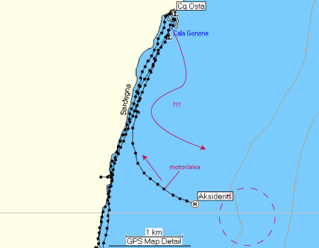 Atpakaļceļā ielieku punktu GPS’ā. Aplis ar raustīto līniju būtu apmēram aksidenta vieta. Tātad kādi 2 km no krasta un stiprā vējā… Tas viss vēl vairāk pa īstam pielec tikai pēc tam. Esam krastā. Pa ceļam vēl mēģinām iestāstīt kādai ekipāžai, lai turas pavisam gar krastu, bet acīmredzama reakcija neseko.