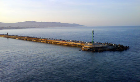 Bāka uz līča stūra pie izejas jūrā. Pa ceļam šauruma otrā pusē amerikāņu karakuģis.