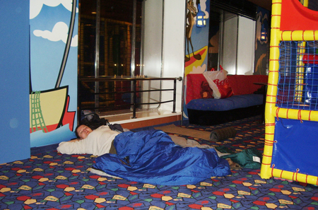 Beidzot slīpi. Nakti pavadam guļot uz prāmja bērnu zonā 8. stāvā.