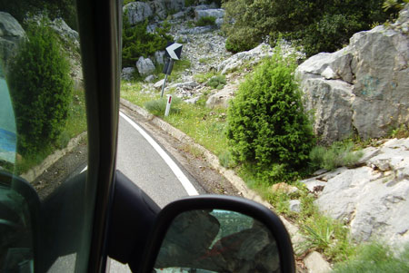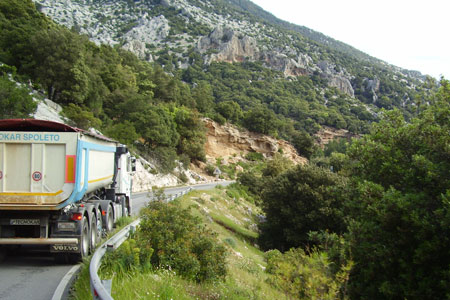 Sekojot tām pašām zīmēm iebraucam ciematā Dorgali pirms Cala Gonone serpentīna. Ja brauktu pa pareizo ceļu, apbrauktu apkārt, bet mēs jau nenojautām. Ieliņa rādās diezgan šaura un pirmajā mirklī šķiet, ka atduras pret kalnu. Luīze braši stūrē cauri garo piekabi un reizēm komentē. Tālu netiekam. Priekšā izlec carabinieru dāma un pūš svilpē. Tas, ka mēs italiano ne kapiš, viņai netraucē turpināt. Var noprast, ka Cala Gonone, kas ir mūsu mērķis pa šo ceļu nebūs, jo tur var izbraukt maksimums ar Punto. Aizsteidzoties notikumiem priekšā, lielākais Itālijā redzētais “privātais” buss bija Ducatto.