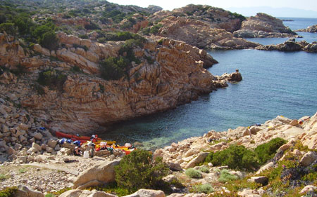 Vējš pieņemas spēkā un pa taisno no mazās saliņas nobriestam tūlītējam pārbraucienam uz Caprera salu. Attālums nedaudz vairāk kā 5 km. Nepatīkams pretvējš. Jau uz salas norimstas un turpinām gar krastu. Kļūst neciešami sutīgs, jūra jau pavisam mierīga. Man no karstuma “besis”. Izkāpjam salas ziemeļu galā un ieraugot tur esošos jaukumus vārds pa vārdam un ar optimismu lūkojoties rītdienā paliekam tur uz nakti.