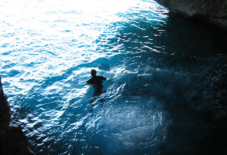 Italiano spēj domāt sakarīgāk. “Where is your friend?” Apmēram, kur pēdējo reizi redzēts? Ak es idiots! Tas tak cirvim skaidrs, ka šāds jautājums ir loģisks. Par laimi Kristaps ir onlainā un zina teikt, ka Cala Fuili. Tas der. Braucam uz pilnu ručku. Motorene lēkā pamatīgi un brīžiem pat apdolbās pret vilni.