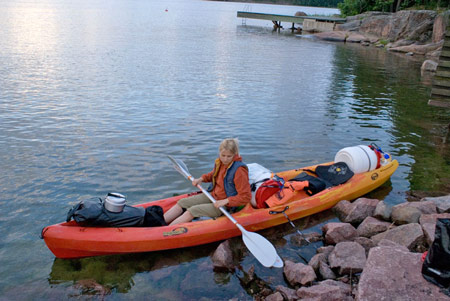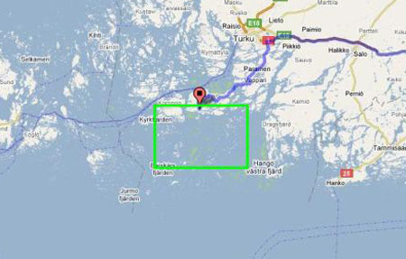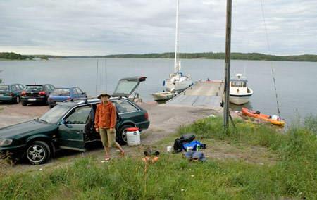 Svētdien 15.07. ap 7 no rīta izbraucam, lai ar zināmu laika rezervi paspētu uz prāmi Tallina-Helsinki 13:30. Šis ir “lēnais” prāmis, kas ceļā pavada 3h15min. Prāmis “Tallink star” to pašu ceļu veic 2h, bet biļetes 2 dienas iepriekš jau izpirktas. Ap 17:00 esam ārā no Helsinku ostas un braucam Turku virzienā, pirms Turku nogriežamies pa kreisi uz Korppoo. Pēc apmēram 30km ar bezmaksas(!) prāmi (kursē ~3x h) pārceļamies uz salu un turpinām ceļu uz vietu, kur esam izdomājuši sākt mūsu laivošanas maršrutu. Beigās braucam pa mazu un līkumotu zemes celiņu. Braucot no Helsinkiem ceļā nākas pavadīt vairāk kā 3h un ap 20:30 esam galā.
