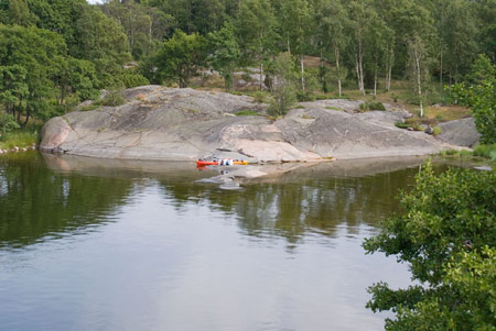 Lietus nav pārāk ilgs, kādu pusstundu palīst un viss. Mēs atkal kāpjam laivās un braucam salai apkārt uz Konungskar, kur ir pēdējā taka, ko esam plānojuši izstaigāt. Uz salas ir mājiņa, kur tādi tūristi kā mēs varētu palikt pa nakti (neviena cilvēka gan tur nav). Vēl ir samērā agrs, tāpēc par nakšņošanu vēl domāt negribas. Kāpjam atkal laivā un braucam tālāk. Līdz nākamai salai varētu būt metri 500. Uz beigām mazliet pašūpo, bet ne tirk traki kā iepriekšējā reizē.