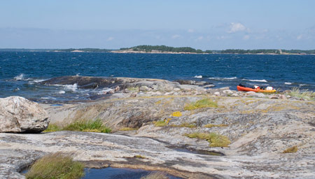 Sākumā iet ļoti raiti. Braucam starp salām, kur viļņi tā īsti nav dabūjuši ieskrieties un tikai salīdzinoši mazos posmiņos šūpo tā stiprāk. Pēc neilga laiciņa nobraukuši garām 2 salām esam pie Stora Hasto austrumu gala. Tā kā salas šeit ir augstas, tad tās piedāvā ļoti labu aizvēju. Tā nu pa aizvēja pusi lēnām braucam uz R meklējot vietu kur ir osta un takas sākums (takas sākuma koordinātes ir iedotas nepareizi, tāpēc īsti nav zināms, kur mums jānonāk). Tiekam līdz salas R galam, bet ostas tā arī nav. Un izbeidzas arī salas aizsegs, pretī pūš tik iespaidīgi, ka mums ātri top skaidrs, pret tādu vēju mēs nepabrauksim. Neko darīt, braucam malā un ejam situāciju izlūkot kājām. Osta ir turpat netālu līcītī, kuram ieeja ir no rietumu puses. Vējā būtu jāveic tikai kādi 100m, bet tas izskatās diezgan riskanti. Īpaši exstrēma meklējumi neietilpst mūsu plānos, tāpēc labāk braucam sameklēt kādu siltu vietiņu aizvējā un salu dodamies apskatīt no turienes.