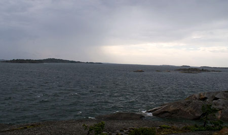 Negaiss. Pēc pusdienas atpūtas turpinām ceļu. Sākumā pa Stora Hasto aizvēja pusi atgriežamies līdz A galam un tad apbraucam divas mazas saliņas, kas ir tieši aiz Stora Hasto. Bet šeit arī iespējas izmantot aizvēju beidzas. Var redzēt, ka no muguras mums tuvojas tumši negaisa mākoņi. Tālāk mums jāveic ~1km pārbrauciens līdz nākamajai salai pa atklātiem ūdeņiem. Cik gan viss ir relatīvs! Labos laika apstākļos liktos, ka tas tāds nieks vien ir, bet šādā vējā izjūtas ir pavisam citas.