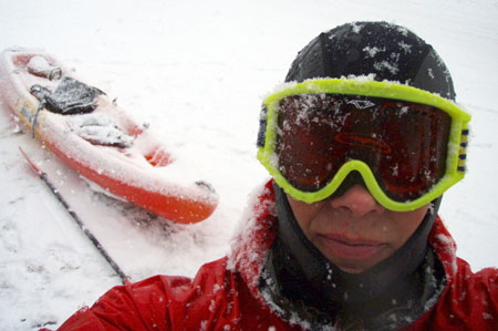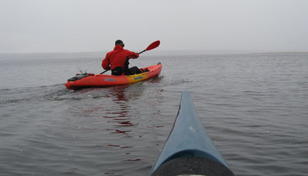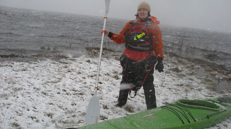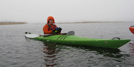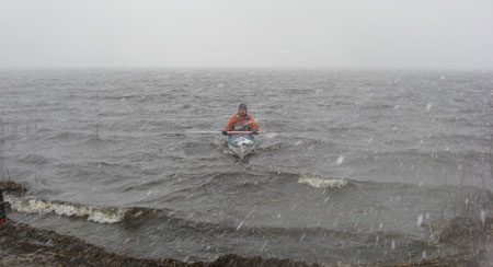 Sniegputenim piederas vējš. Krasts braucot “Baibā” smeķi tā nejūt, bet kajaku astes aizmugures vilnis sāk grozīt. Ja nebūtu Krasta dzītā “glābšanas motorenes”, kajakos būtu ko pabaidīties.
