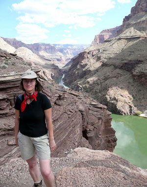 Tik agri lejup kāpiens jāsāk vēlāk gaidāmā karstuma dēļ; to pagrūti aptvert, jo ir auksti, bet pēc kādas stundas auksti vairs nav, un vēl pēc maza brītiņa sākam mest nost apģērba kārtas. Kopā līdz upei jānokāpj ap 15 km; vienā brīdī no saviem ceļabiedriem atraujos, jo jūtu, ka karsts tiešām būs un kā karstuma nemīlētāja vēlos galā nonākt pēc iespējas ātrāk. Ik pa brīdim ceļā gadās augšup kāpēji; no sirds jūtu viņiem līdzi un jūtos mazliet kā vieglā ceļa meklētāja, jo jāatzīst – tad, kad izrādījās, ka nevaram dabūt ceļojumu cauri visam kanjonam, izvēlējos to, kurš sākas ar nokāpšanu kanjonā, nevis beidzas ar izkāpšanu no tā. Bet arī lejupceļš nav viegls, un es vispār esmu slikta lejup kāpēja; pēc 9 karstums jau kļūst neciešams, un dažus īpaši saulainus un bez ēnainus ceļa posmus velkos kā knapi dzīva. Nokļuvusi līdz Phantom Ranch, pat nespēju iet meklēt galveno ēku ar kafejnīcu – atradusi ēnaināku vietiņu un apsegusi seju ar samitrinātu bandanu (lai dzīvo šis aksesuārs, jo īpaši slapjā veidā!
