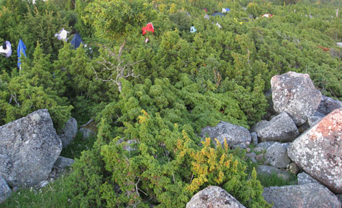 Vakarā starp kadiķu audzēm esam iekārtojušies naktsmājām un no malas izskatās, ka te būtu atbraucis ceļojošais cirks – telts, pie telts, vienīgi Arnis, vientulību meklējot, uzslējis savu mājvietu pašā jūras krastā.