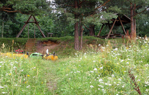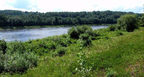 Upe mūs “paņēma” uzreiz – ļoti pamanāma straume un pat neairējot ātrums ir lielāks par 5 km/h, tāpēc bez liekas “iespringšanas” tikām līdz Krāslavai, bet pēc tās sākām meklēt nakšņošanas vietas. Pirmajā dienā uz Daugavas ar kultūrtūrismu neaizrāvāmies – gribējām pierast pie upes un tikt cauri Krāslavai, lai neatpaliktu no iecerētā grafika. Nometnes vieta – ekselenta, negaidīti laba. Nojumīte, galds, soliņi, ugunskura vieta, tualete un, kas neticami, neviens nav paspējis tur iekārtoties.
