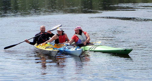 Lai gan šī un vēl pāris citas ekskursijas nozaga laivošanai paredzēto laiku, izrādījās, ka ieplānotos gandrīz divdesmit kilometrus pirmajā dienā var pieveikt itin viegli. Piektdien krietni vēlā pēcpusdienā sakāpām upē – trīs kajaki (Arnis, Mārīte un Maija) un divas meitenes ar SOTu (Gita un Ildze).