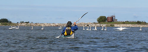 - Tur sastopam līdz šim lielāko gulbju koloniju. Mēs viņus esam iesaukuši par “boeingiem”, jo iztramdīti tie vispirms ieskrienas pa ūdens virsu tad lēzeni paceļas līdzīgi kā lielās lidmašīnas, taču vienmēr pret vēju. Tā kā airējot pa jūru izklaides nav pārāk daudz, “boeingi” mums patīk.