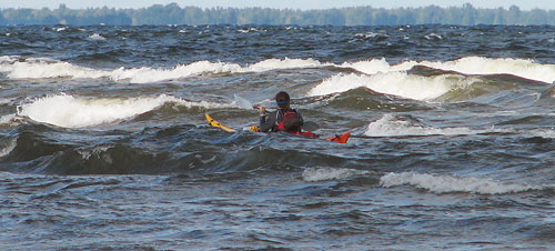 - Plkst. 16:35, apmēram Ragaciems un kopā noairēti 20km. Izbraucot no mānīgā aizvēja pie Ragaciema iekļūstam īstā sērfā. Aizvēja vilināti uz raga mēģinājām apbraukt sērfu un braukt dziļāk – neizdevās! Midis razkolbasījās. Ar zināmām grūtībām, bet krastā tikām. Tiek pieņemts lēmums šodien finišēt, tāpat nav braucams, plīstošie ir līdz pat 2 m un tos “dusmīgākus” padara Ziemelis. Jūra rāda savu spēku!