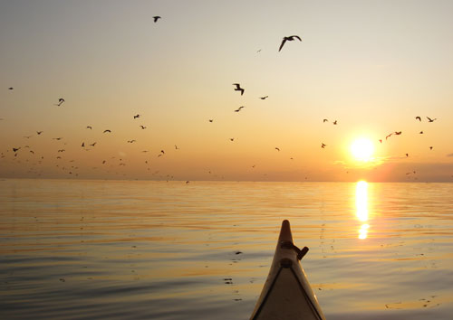 Kamēr ar Luīzi pakojamies un gatavojam brokastis, mākoņi izklīst, taču parādās arī solītais vējš solītajā virzienā. Lecu kajakā un airēju uz ragu. Līcis mierīgs, taču uz līča un jūras robežas jau balta jūra.