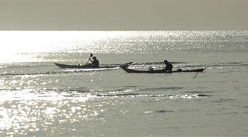 Apairēju ragu un ieņemu taisnu līniju. Kādu brīdi airēju. Tomēr nē. Seklajā jūrā viļņi nav lieli, taču visi spēki aiziet stiprajā vējā un pret straumi mēģinot valdīt laivu. Nes jūrā. Ir pa traku. Ātrums bēdīgs. Apsveru, ka ceļojuma pirmajā dienā varbūt varētu mēģināt spītēties, taču esmu viens pats un spēka nav tik daudz. cik gribētos. Griežu atpakaļ. Atpakaļ iet labi – tikai piestūrējot 10 km /h.