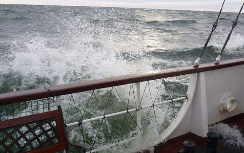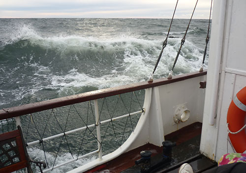 “Dranķīgāk būs uz beigām”, secina stūrmanis. Vējš DA 12-15 ms. Sākumā viļņi 1-1,5m, ceļa otrajā pusē 1,5 -2 m, atsevišķi ekemplāri varētu būt pat līdz 2,5 m.