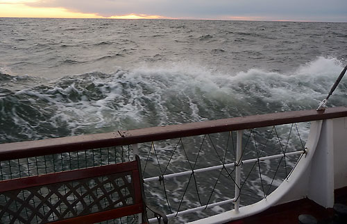 Kuģis iet zig-zagiem, saņem viļnu triecienus te no sāniem, te griežas vilnī ar priekšgalu, zvalstās, krakšķ un brakšķ. Lido nenostiprinātie priekšmeti. Pasažieru “salonā” lazarete.