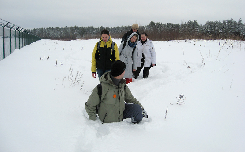 Šķērsojam pļavu pirms meža. Kājas sāk just, ka pastaiga sniegā prasa piepūli, bet mežā sniega nav mazāk – gar žogu iet ir vieglāk. Pirmās mājas. Saimnieks draudzēties nav noskaņots, bet suņus vaļā nepalaiž. Turpmākais ceļš līdz lidostas teritorijai jāmēro pa atklātu vietu un sniegs tur jau pāri celim. Ko padarīsi – turpinam zosu gājienā un pa laikam maināmies vietām: iebrist taku pirmajam nav vieglais darbiņš. Atklātajā vietā žogs kļūst arvien zemāks, kam varētu būt saistība ar to, ka sniegs zem kājām – arvien dziļāks.