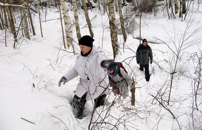 Spriežam, ka tuvāk mežam sniega būs mazāk vai, ja paliks grūti, iesim pa mežu. Paceļas dažas lidmašīnas, taču ātri pazūd mākoņos. Vērojam, dzenam muļķi.