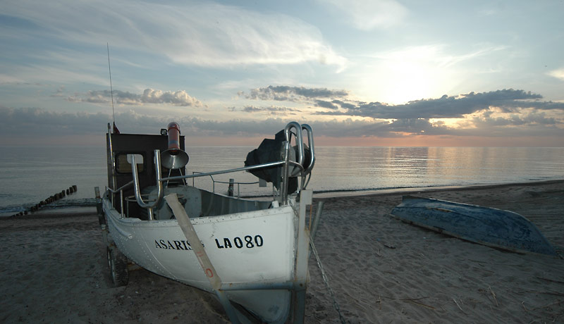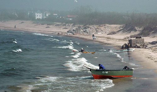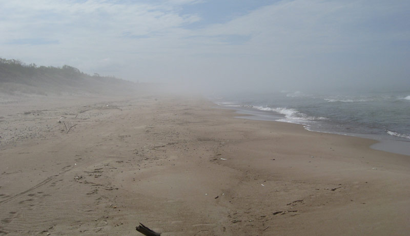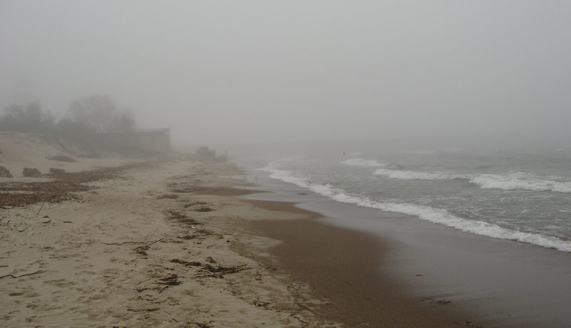 8:00 – plānojām laisties jūrā jau no agra rīta, kamēr vēl nav vēja. Sakrāmējāmies un dodamies ekskursijā uz jūru. Nesanāks – vēja nav, toties vecie jūras viļņi ir gan. Ātri parādās migla (kas nebija, kamēr vilkām hidras) un tāpēc negribās mēģināt. Redzēt nevar neko, tikai dzird šermuļus uzdzenošās kuģu miglas taures no Klaipēdas puses. Atkal sēžam krastā.