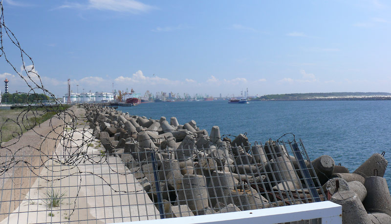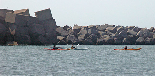 Arī mola aizsargvalnis no ūdens puses izskatās ļoti liels salīdzinot ar vakar no krasta redzēto un attiecībā pret mūsu mazajām laiviņām. Atpakaļceļa vairs nav, mobilizējamies un stipri airējam. Pa priekšu vienam ne pārāk lielam kuģim un šķērsām velkonim.