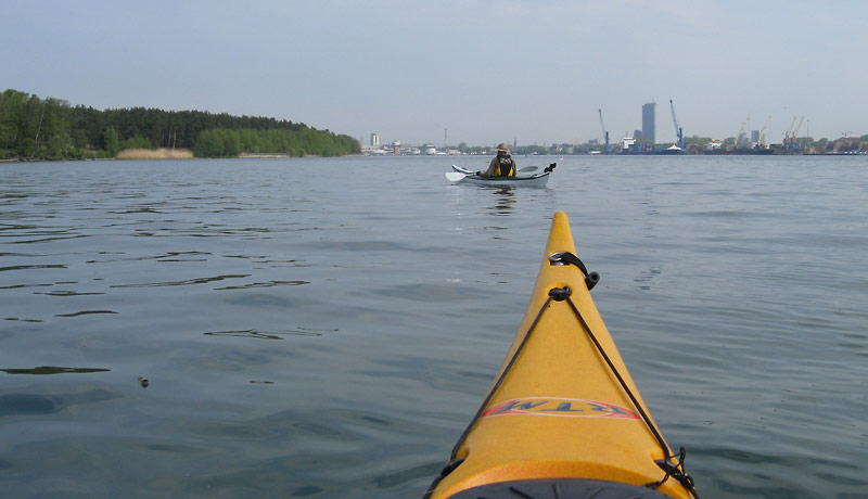 Prognoze sola Ziemeļu vēju 4-5 m/s un nepacietīgi spriežam, ka jābrauc. Līcis spogulis. Airējam ostas akvatorijā. Pārsteidz dzīvā kuģu satiksme. Šaurajā kanālā lielāki un mazāki kuģi kursē viens pēc otra.