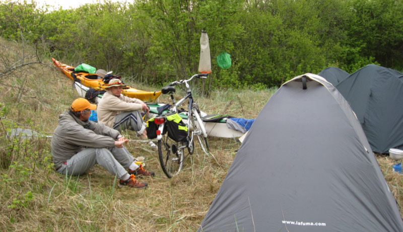 Tā kā piespiedu izkāpšanas vietā nebija iespējas piebraukt supporttīmam, krājumu vadāšana līdzi atmaksājās. Zvanam Krišam minot orientierus kartē, kurš vadoties no tiem piebrauc ar velosipēdu. Paliekam trijatā. Vietiņa trāpījusies glauna – pārsimts metru iekšzemē veloceliņš, bet uz jūras pusi, kur mēs, īpaši aizsargājama piejūras teritorija. Neviena cilvēka. Nodēvējam par Ērču Pļaviņu.