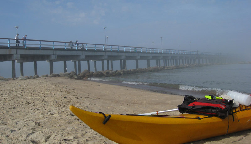 Aiz kāpas ir silti un labi, tikai nav īsti ko darīt. Braukt miglā viļņos nešķiet perespektīvi. Rezultāts 2:2 – divas dienas braucam, divas dienas sēžam krastā. Māris pieved krājumus līdz tuvākajai vietai, kur var piebraukt ar auto. 21:00 – migla sāk izklīst, bija pērkona negaiss, toties viļņi sakārtojušies glītās rindās un jūra rimstas. Patiesībā ideāls sērfs. Rīt ceram beidzot tikt līdz Latvijai.