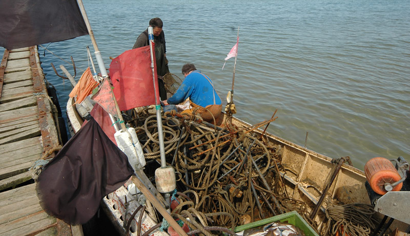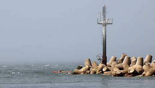 Mola galā viļņi. Kas, protams, „atstarojas” no mola radot „tirinātāju”, savukārt aiz mola virzienā uz krastu viļņi ir vēl lielāki. Laivas piekrautas: līdzi telts, guļammaiss, apģērbs, ūdens un pārtika divām dienām… Neesmu neko tālu aiz mola, kad neredzamā miglas taure jau skan tepat blakus un no miglas iznirst liels spoku kuģa siluets. Domāt nav laika un visi (tfu, tfu, tfu + trīsreiz pie koka) sparīgi airējot esam aiz mola krastā. Patiesībā labi, ka ostas darbinieks mūs aizturēja – bail iedomāties, kā būtu sastapt lielo kuģi miglā šaurajā izejā uz jūru. Adrenalīns bija.
